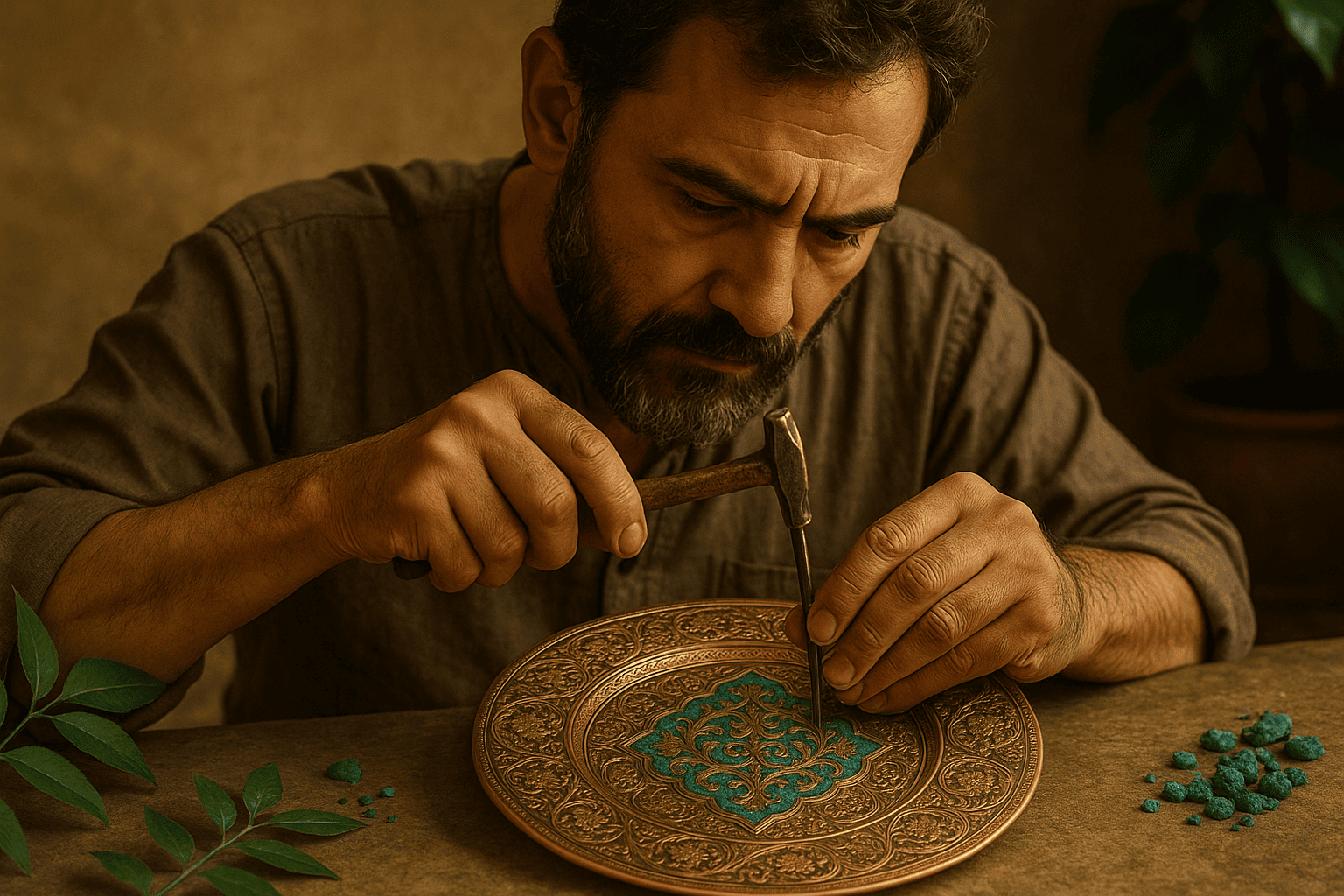 The primary tools in Ghalamzani are quite simple: a chisel (ghalam) and a hammer. However, the magic lies in the artist’s craftsmanship. The metal canvas is typically made from copper, gold, silver, brass, or other malleable metals that can withstand repeated hammering without cracking. Artists may also use pitch (a type of black resin) beneath the metal to support and absorb shock during the engraving process.