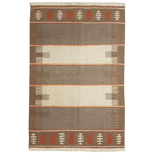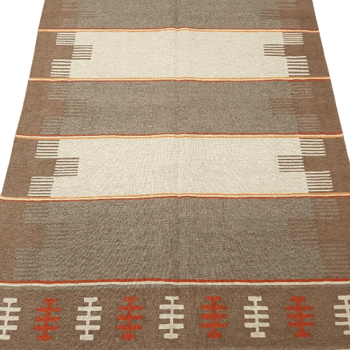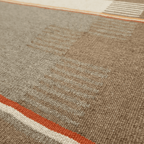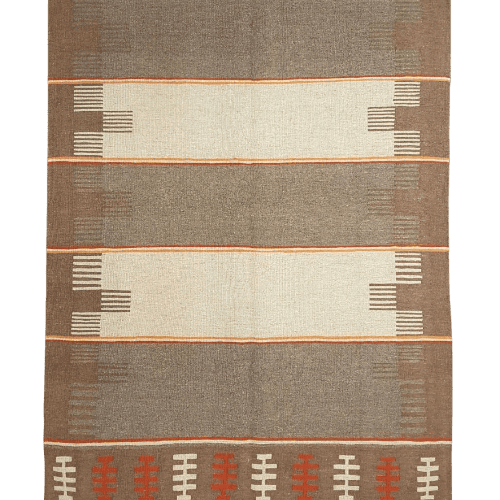 Artisans crafted this kilim using weft-faced, slit-weave techniques, ensuring structural integrity and a clean visual rhythm. The foundation features a premium wool warp, supporting dense rows of high-quality Kurdish wool. The use of both undyed natural fibers and plant-based dyes adds depth and richness to the earthy color palette—without relying on synthetic chemicals.